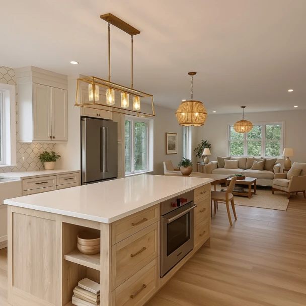 The oversized island anchors the room beautifully, making it perfect for everything from family breakfasts to late-night chats. Clean, bright, and endlessly versatile.