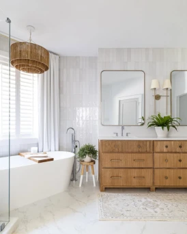 This bathroom nails the balance between cool stone and warm texture. The marble adds refinement, while the wood tones soften everything and make the space feel inviting.