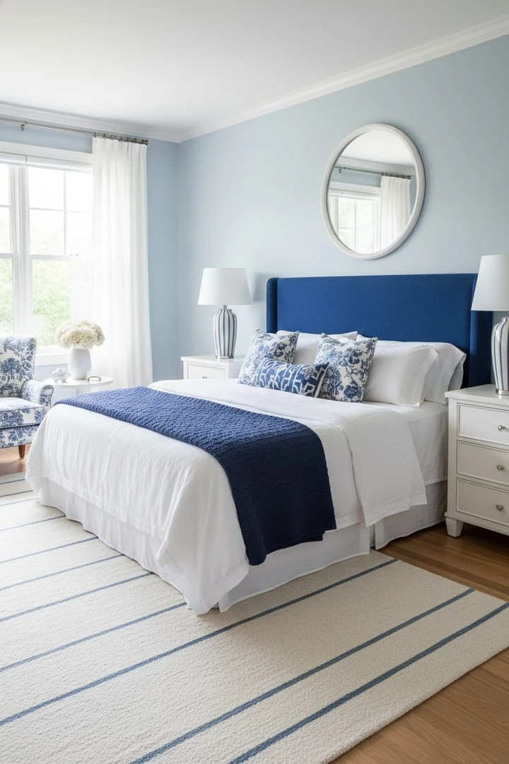 This space leans into that relaxed, coastal energy without going full beach house. The blues are crisp, the whites are clean, and nothing feels overdone.