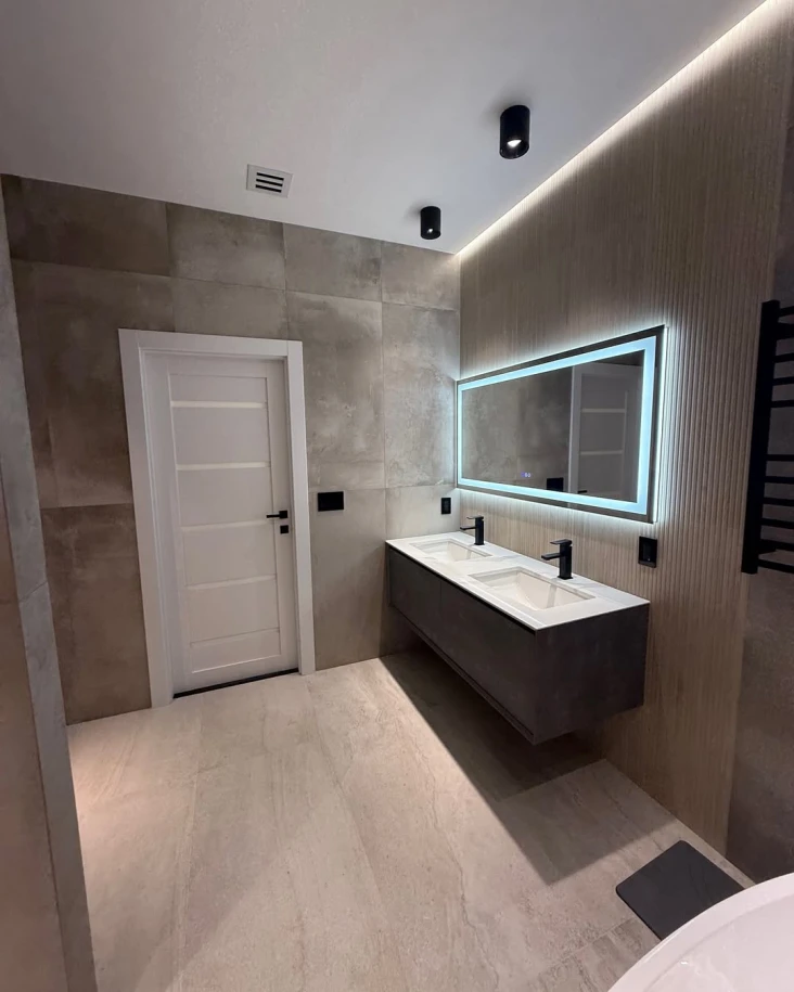 This setup feels like stepping into a boutique hotel bathroom. The door blends seamlessly into the tiled walls, letting the finishes and lighting take the spotlight.