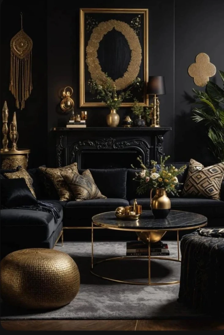 Velvet, gold, and drama—this space is pure dark elegance. The matte black walls melt into plush navy seating, while golden accessories shimmer like candlelight. Everything here whispers opulence, from the metallic pouf to the intricate mandala wall hanging.